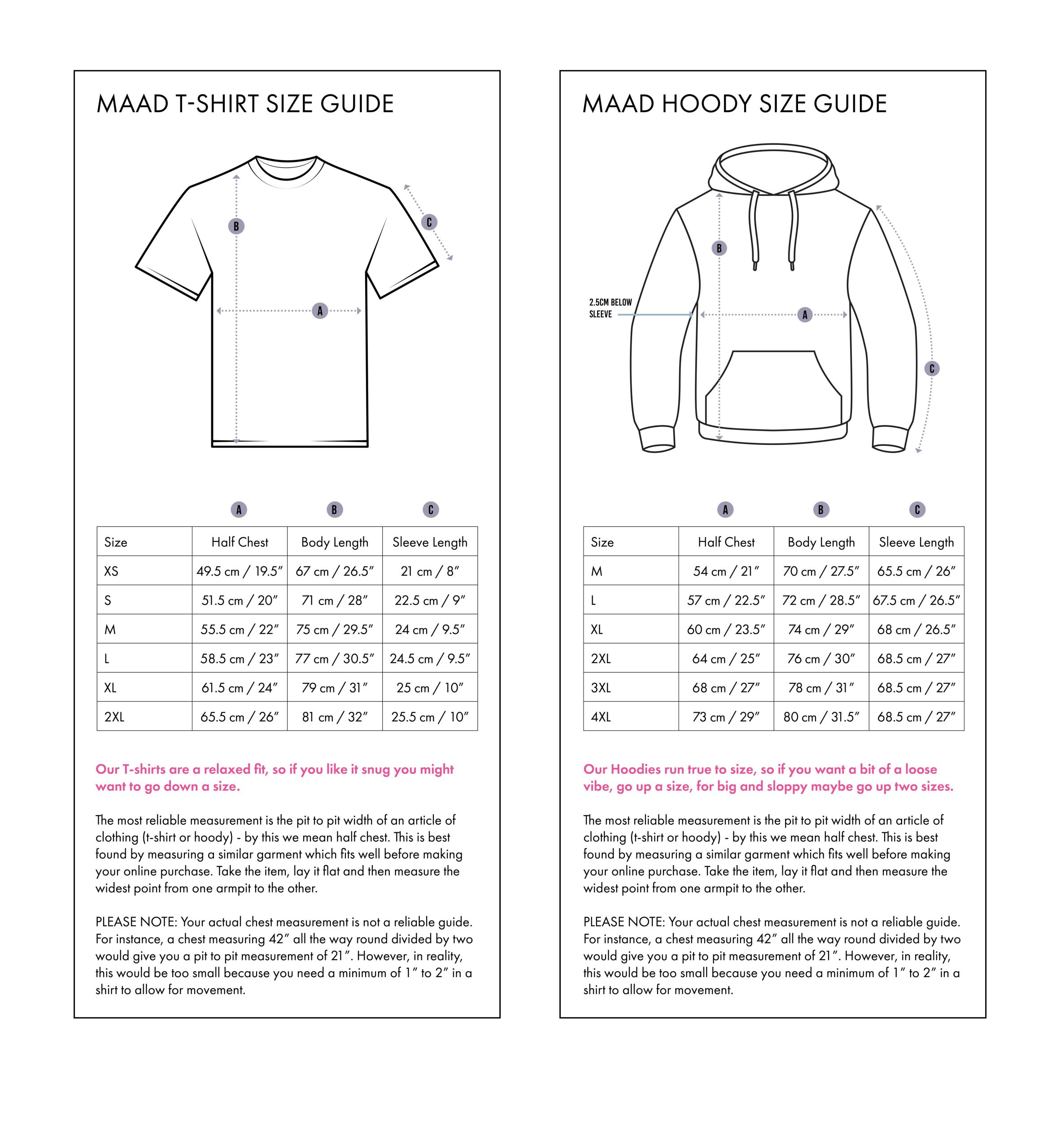 Please follow the washing instructions on the label to get the most out of your new MAAD garment, (you don’t have to, but we wash ours inside out). If you are into ironing…do not iron over the printed graphics, we iron ours on a cool temperature and inside out just to play safe.