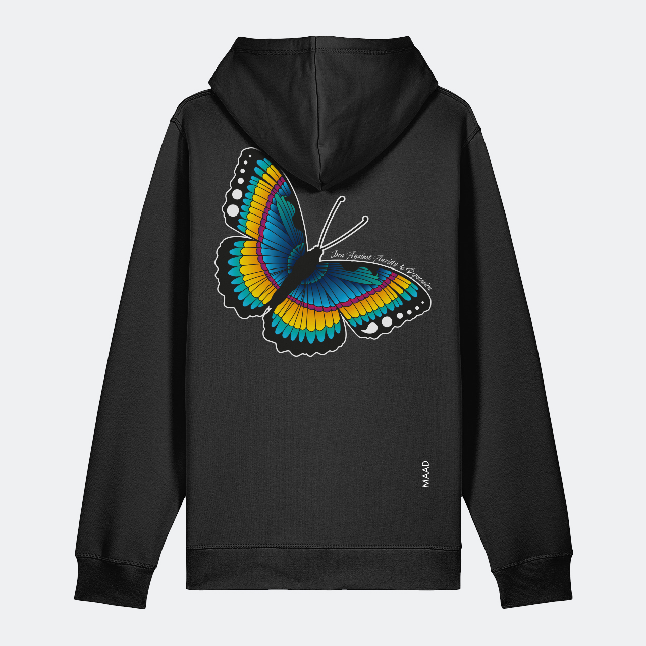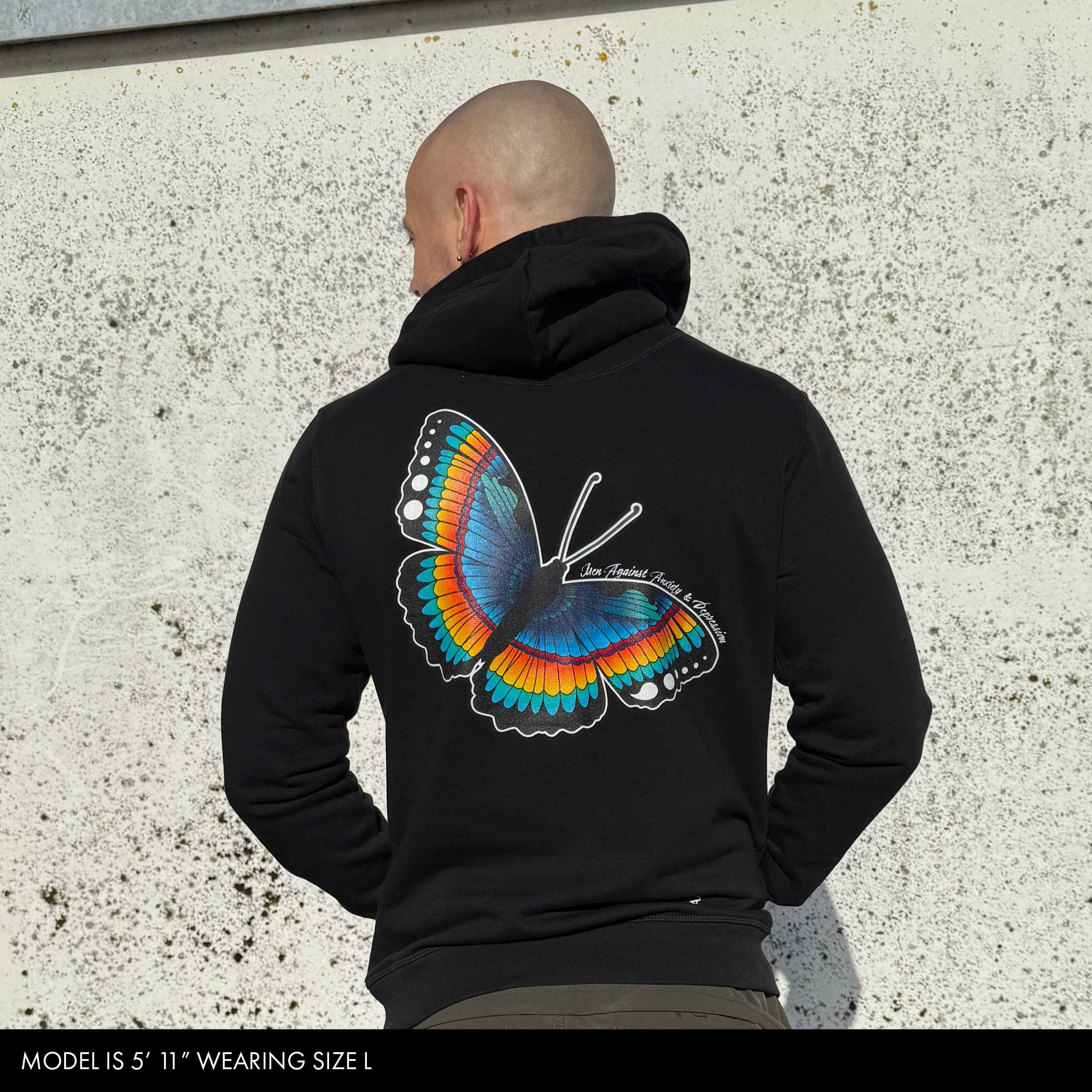 ‘Blue Morpho’ is our handdrawn symbol for transition and gives a nod to traditional tattoo styles. Also incorporating our signature semi-colon graphic representing solidarity for mental health awareness… your story isn’t over.