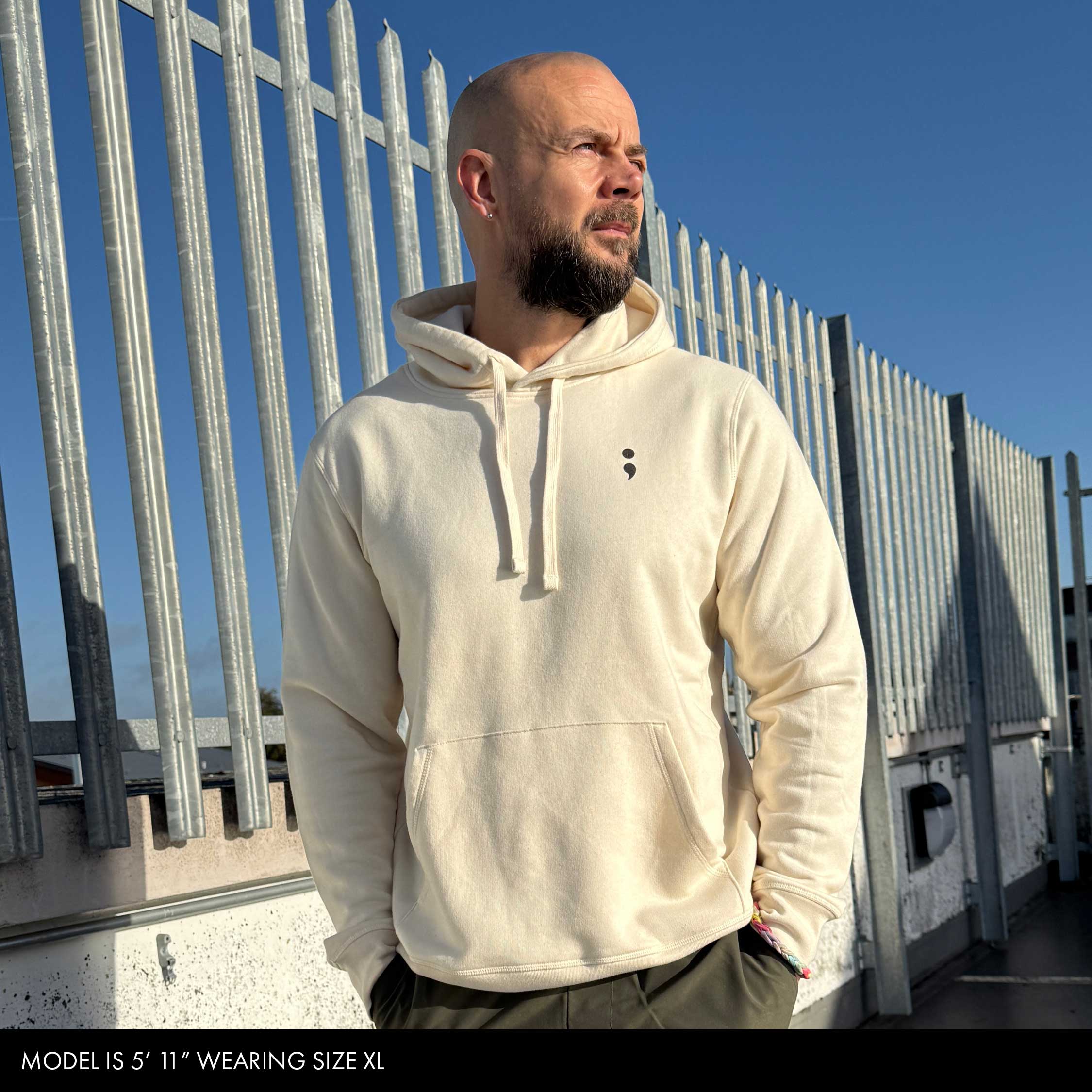 Our Hoodies run true to size, so if you want a bit of a loose vibe, go up a size, for big and sloppy maybe go up two sizes. Our model is height 5' 11" wearing a size XL.